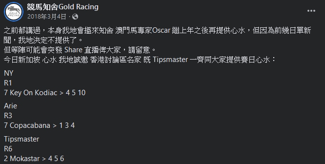 狂小編對於這種忽冷忽熱的態度有所不滿。而這個專頁,就是現在香港功德會認可的賽馬KOL《競馬知舍》,最後還鬧狂小編狗血淋頭,自此與他們亦「一刀兩斷」