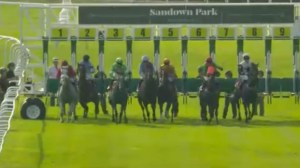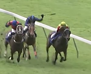 過往也有騎師因為跌鞭以拳頭代鞭,不過法雷拉選擇以帽代鞭,雖然最後被「全體注意」(Attention)追過,但仍能以第二名完成。