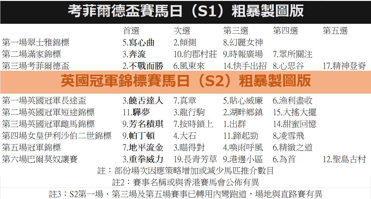 最後是冠軍錦標「地平流金」這匹三歲馬已經取下四連勝,贏出多拉爾錦標一場也是贏得十分輕鬆,難怪評分已經去到120分,今場又可以在變化地上陣,有望再可突圍。「瞄得對」的假像是,只懂跑快地以及去年凱旋門大賽包尾,不過以前也在好至黏地場地中贏馬,相信隨著能力進步,變化地也沒有問題。「喚雨呼風」去年此賽奪冠,以為今年要一場未勝告終,不過在上月尾贏出表列賽,雖然難勝,但仍可爭上位。「精緻之道」在雌馬賽中發揮實而不華的能力,上次不幸敗陣,今次在變化地中亦能發力,就算無法上陣,也不會輸得太誇張