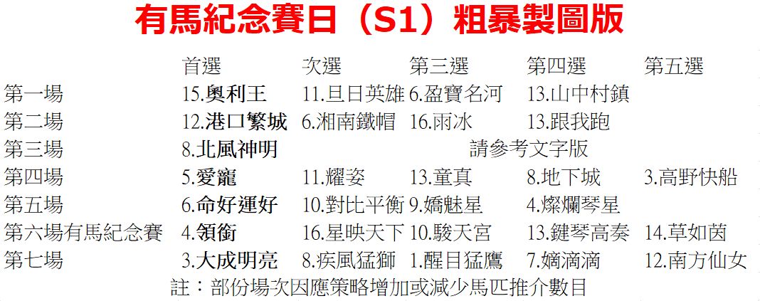 有馬紀念賽實在一場意料之外的大混戰,星級馬退出之餘,實力馬之中亦有主要退出份子。賽事有「鐵甲巴魯」領放,不過可惜途程是2500米而非是3600米。「好愛美」明顯不夠班,「瑪蓮必勝」安心退役。「緣厚情摯」日本盃太失望。其他不過20倍的主力完全不敵看死。最不穩的是「勝局在望」雖然日本盃見好,又可以用回武豐,但在膠沙地快試竟輸給一匹處女馬,到底是什麼事呢?