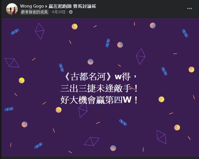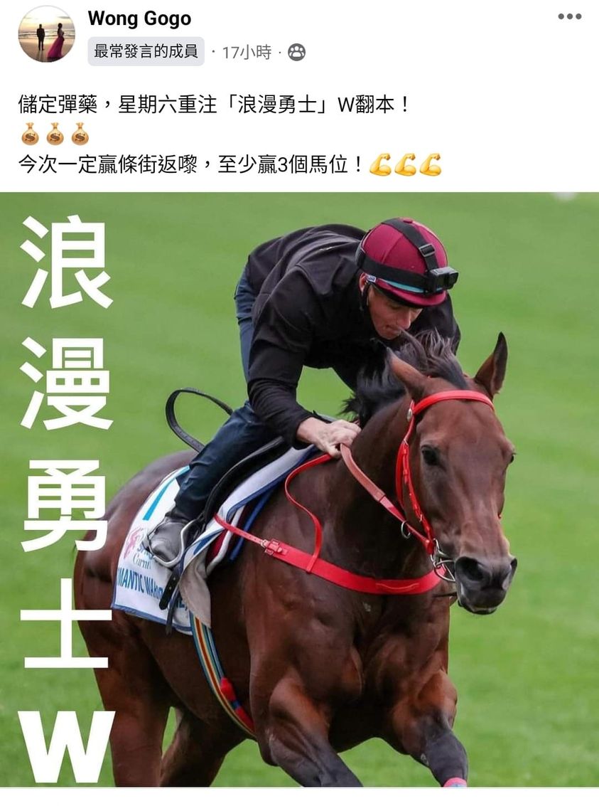 上述提及的Wong Gogo在覺士盾檔位抽籤不久,很肯定「浪漫勇士」贏出覺士盾。