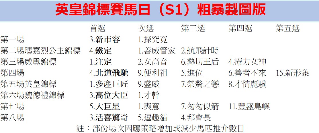 瑪嘉烈公主錦標,「鐵定」希鐸初出輕出贏得輕鬆,料之後有不錯發展。「善良管家」於皇家雅士谷輸給一匹實力不錯對手跑亞軍,莫雅接騎成大熱。「航飛計時」唯一贏馬途程是1200米賽事,上三戰於1000米跑近,當然可以考慮。