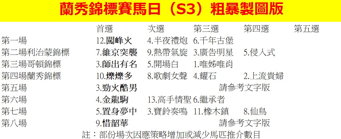 第四場蘭秀錦標,「爍爍多」贏出法國橡樹大賽,拍賣時亦由原馬主希望保持,馬匹確實比起法國一千堅尼時進步許多,今次有力進擊。相信「歌劇女聲」角逐2000米也沒有問題,既然兩歲時已經贏出1600米一級賽,增程時機己到。「耀石」雖然難在一級賽勝出,但仍爭上名也沒有問題。「上流貴婦」似乎找到了正確跑法,雖然外檔不是因素,只要不受影響仍然可以入圍。