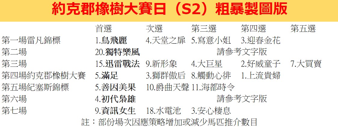 第四場約克郡橡樹大賽,能夠將一匹短途母系,化為中長距離馬,沒幾個練馬師可以做到,岳伯仁就是其中一位,馬匹漸漸適應一哩模後,增程角逐更長路程,結果在愛爾蘭橡樹大賽成為大熱,可惜「滿足」被困只獲亞軍,今場擔正上陣沒有問題。次選為「獅群傲后」,於希鐸連贏哩半三級賽及二級賽,馬主希望父系可以打響名堂,雖然已去,但有多一匹子嗣贏一級賽冠軍結果更好。「觸動心扉」母系贏出同場同程表列賽,照道理馬場合發揮可作第三選。「上流貴婦」練馬師最後還是投宋文赫信任一票,馬匹如能發揮美寶莉錦標水平,不是沒有機會。