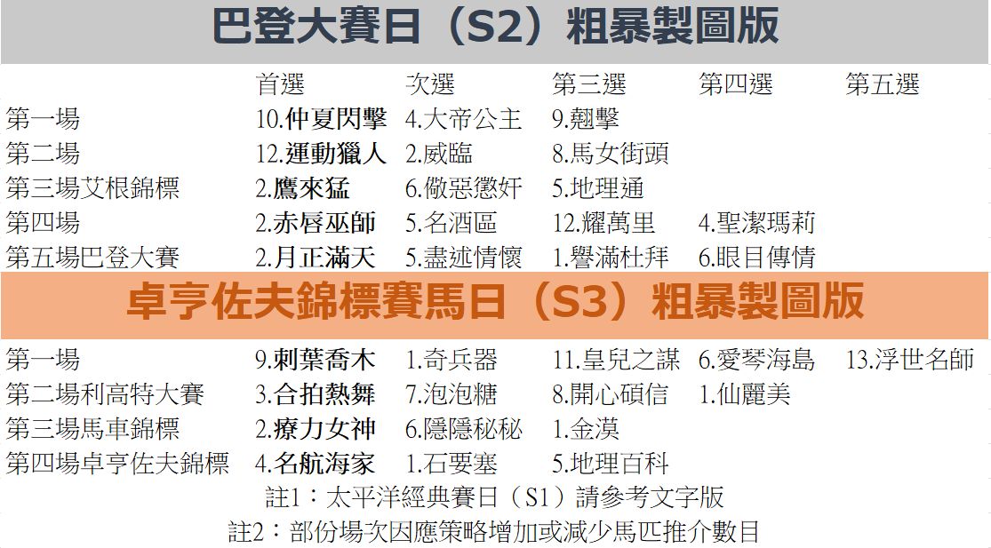 最後一場是巴登大賽「月正滿天」已經開始於夏季調整應有表現,巴伐利亞大賽處理不錯,不過被狀況更好的「奇力駒」擊敗。次選是「盡述情懷」馬匹已經在柏大賽跑回本事,不是德國打吡應有的樣子。「譽滿杜拜」贏出聖格盧大賽再挑戰英皇錦標實力當然超班。第四選可選德國橡樹大賽亞軍「眼目傳情」,上場後追相當強勁,不像補充報名來的馬匹。