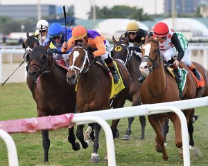 中山第六場新馬賽,莫雅策騎的大熱門「龍王」(Lord Kanaloa、ロードカナロア)子嗣Dio del Mare(ディオデルマーレ)在直路落後不少,不過及時於終點追上Shonan Marina(ショウナンマリーナ)以及Win Kirara(ウインキララ)