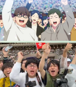 造就一眾肥宅,把賽馬娘一小幕神還原,不過據知最前方的兩位是日本人,後方才是一眾香港馬迷。