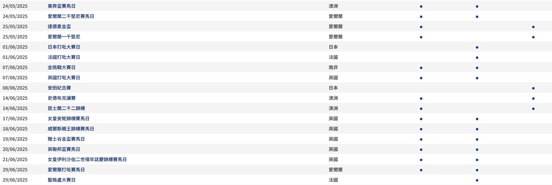 櫻花賞及日本橡樹大賽被刪除。馬會亦安排設有新馬賽的11場日馬。想播也不行。另外英國一千堅尼錦標也沒有。至於賽日方面,由五月開始,每週六或週日最少有一個轉播賽,除了皇家雅士谷前週末有兩場賽事。去到馬季煞科前一週大開快車的方針不會改變!