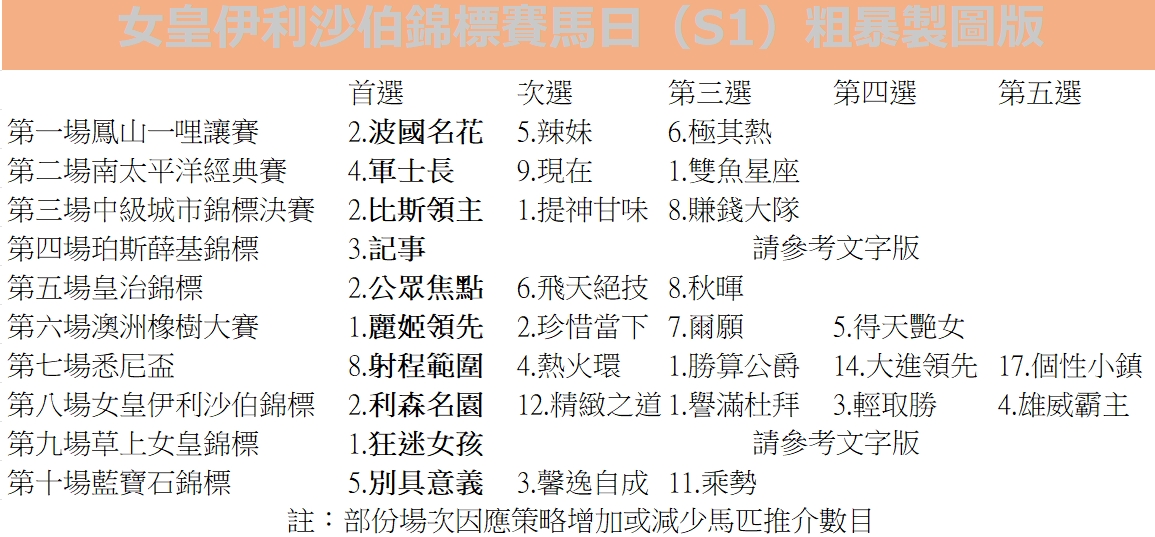 第一至三場、五及第十場推介馬匹較少,敬請留意