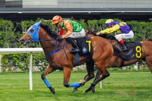 第五場四班1800米韓國馬事會錦標。南美兵「香港神駒」(Harmony Galaxy)(艾道拿)排在外檔,從後大外一氣,過了「獎星」(Can’t Go Wong),取下兩連勝,次仗三班見!