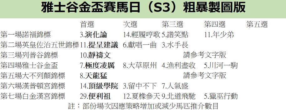 第四場雅士谷金盃,「極度凌厲」初出一直贏馬,雖然在初戰草地的三級賽中敗陣,不過很快贏出韋傑亞女子爵錦標,除非好至快地過於乾快,否則會是首選。也感覺到牠是另一匹「波斯小村」。「大草原州」要接棒「饒舌達人」上次出戰稍比哩半長的三級賽也沒問題,去年亦贏過女皇瓶賽,增程4000米也不成難題。「漁利盡收」雖然在杜拜金盃失敗而回,不過兩個月後輕取一場三級賽,返回英國上陣似乎更佳。「川河一駒」雖在草地只獲一勝,但於膠地賽事有出色表現,包括贏出紐卡素總冠軍戰,跑4000米應沒問題。
