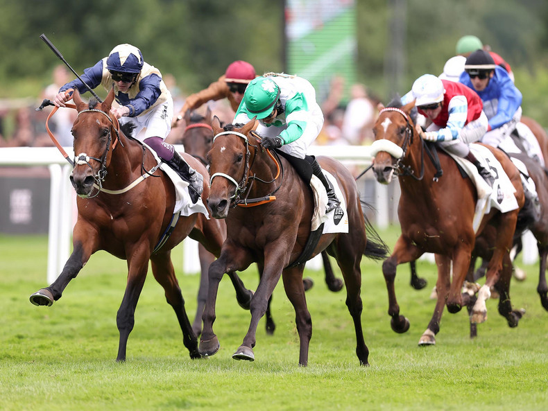 「頂峰群山」(Hochkonig) 終點前力壓熱門之一「凝聚」(Convergent)取下勝利,享受德國打吡大賽的歡悅。
