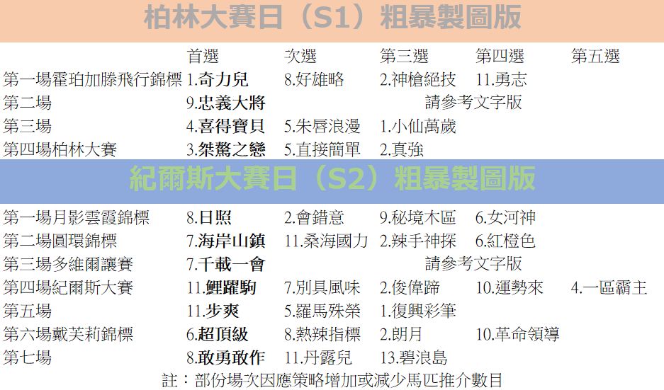 全日主題賽事為紀爾斯大賽,考慮到「別具風味」的最終賠率未能有2倍,博一匹實力不錯的半冷馬「鯉躍駒」,於英聯邦盃跑獲季軍,當中賽事的亞軍及頭馬於次仗亦交出表現,相信更慢的場地更合發揮。「別具風味」從未在歐洲敗陣,當然就此將其忽略極為不合理。「俊偉蹄」除了季初出三級賽大敗後,早前亦贏出三級賽,加上跑一級賽長期表現穩定合不考慮。「運勢來」亦贏下一級賽而來,實力當然不簡單,有力乘勝追擊。另一匹邊線馬選擇是「一區霸主」不論角逐1000米及1200米相當出色的馬匹,今次首次增程較長的賽事也不能忽視。