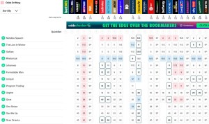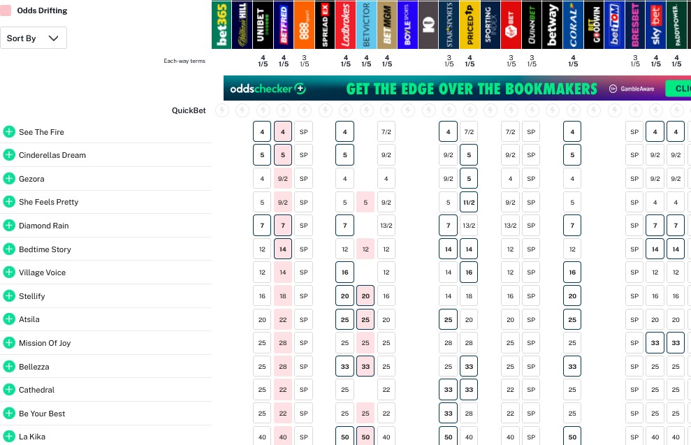 最後是雌馬草地大賽。「自信最愛」(She Feels Pretty)出道全上名,即使面對歐洲馬仍然毫不畏懼,兩個月前於戴萊錦標中鬥贏「鑽石雨」(Diamond Rain)取下勝利。那麼高多芬派出「仙履奇夢」(Cinderella’s Dream)上陣也不過份吧,當然「鑽石雨」也是其副車。「姬爽朗」(Gezora)雖在凱旋門大賽敗陣,但之前角逐紅寶錦標問題不大。「觀火」(See The Fire)表現大致穩定,亦於歌劇錦標中跑獲亞軍。「床邊小話」(Bedtime Story)為岳伯仁上陣,於中距離尋找突破。