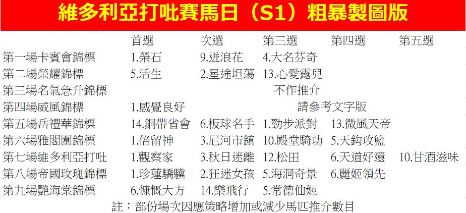 接著是維多利亞打吡,這場賽事的參戰馬上場不是跑滿利谷瓶,就是較早時間的智朗經典賽以及考菲爾德經典賽。「觀察家」當然佔優,料遇上北半球馬匹前繼續發揮優勢,上場角逐滿利谷瓶簡單是超級大讓賽,可以作膽。考菲爾德經典賽組別可選「秋日迷離」,一上1800米贏馬,其後再贏下2000米的三級賽,今場可以取勝。「松田」可作賽事最大冷門,馬匹於智朗經典賽一直前領,到最後100米才被追過,相信氣勢並不止於此。「天道好還」滿利谷瓶後追相當強勁,差點讓薛凱華老貓燒鬍,狀況一好有權贏馬。「甘酒滋味」一度在考菲爾德經典賽領先,但最後被追過,也是頗有潛力的馬匹。