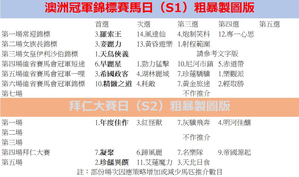 第三場是女皇伊利沙伯錦標,不是4月那場一級賽,而是為錯過墨爾本盃或為2026年賽事作準備,跑入三甲就可以由零開始。「天鳥俠義」上次角逐考菲爾德盃失機,今次賽事只要改變走勢有力還擊。「個性紅酒」兩度於長途讓賽上陣,今次跑回合適的路程有力反擊。「罕世寶」上次贏出日本中央競馬會錦標回復本色,今次可以重新來過作出反擊。「傳神詮釋」上週三表現已經回復,今場有力改變形勢。