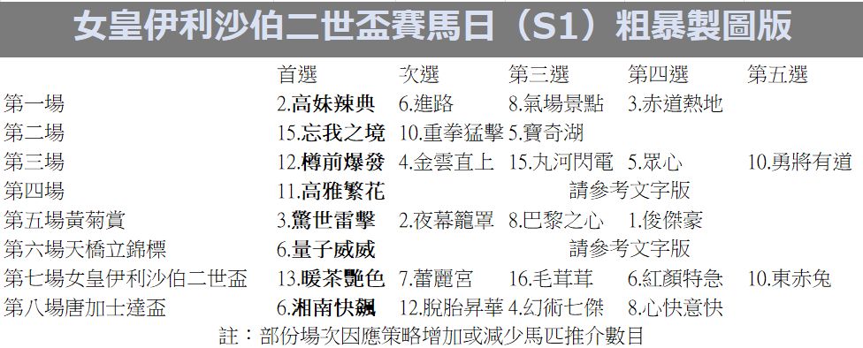 女皇伊利沙伯二世盃,先選一些不會要的馬匹「驍智嬌娃」弱配不被看好。「北島名花」年事已高。「功成珍寶」戰意不足。考慮到只有「紅顏特快」放頭,估計步速不算太快。首選是「暖茶艷色」上戰於札幌紀念賽猛追之下取得亞軍,上次於2000米有突破,跑2200米相信沒有問題。「蕾麗宮」今年只是跑了兩場,並於九月贏出All Comers,雖然去年角逐此賽事並不理想,不過今場賽事隨著與戶崎圭太合作料有改善。「毛茸茸」自從櫻花賞跑獲季軍以及橡樹跑獲第五後未有上陣,雖然仍可角逐條件賽以及排外檔上陣,但一補上就選杜滿萊,似乎頗有信心。秋華賞亞軍「紅顏特急」跑回信心,似乎有機會突圍。「東赤兔」可做冷門馬,馬匹早前取下兩連勝,上戰愛爾蘭錦標看似發揮不理想。