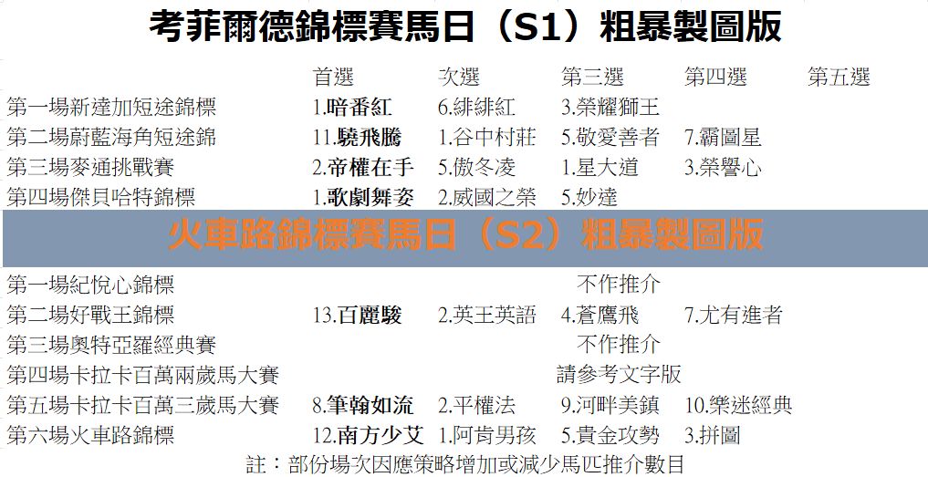 第一場新達加短途錦標「暗番紅」季初贏出一場後大敗,但似乎受到干擾下大敗,相信可在之後的賽事找到出路。「緋緋紅」表現穩定,於海外對手前來必有不錯發揮。「榮耀獅王」於美國出賽水準不差,跑1200米不短。「好命數」可作四重彩的第四選擇。