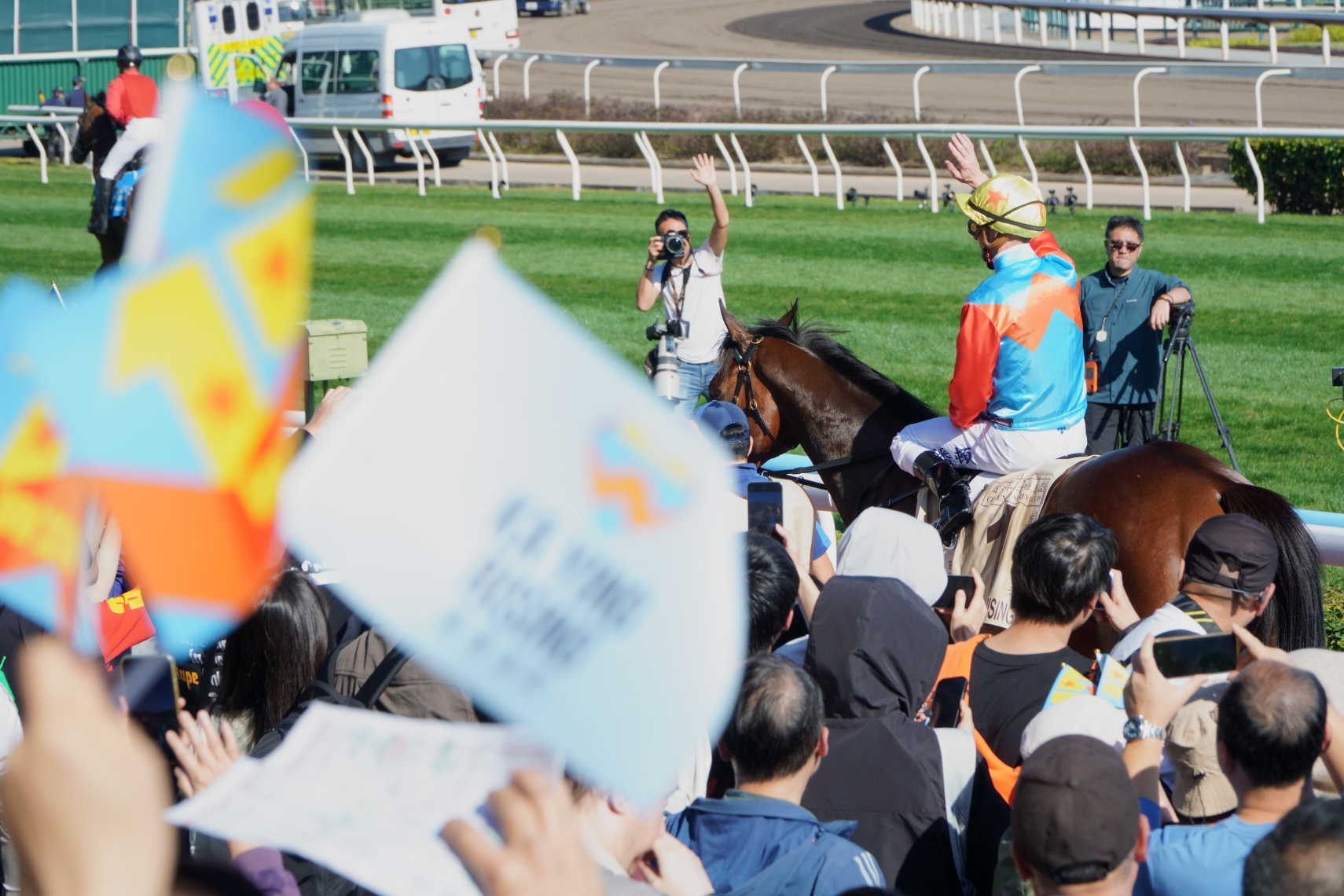 除了有吶喊歡呼的馬迷。也帶同馬會送贈或自製橫額支持「嘉應高昇」