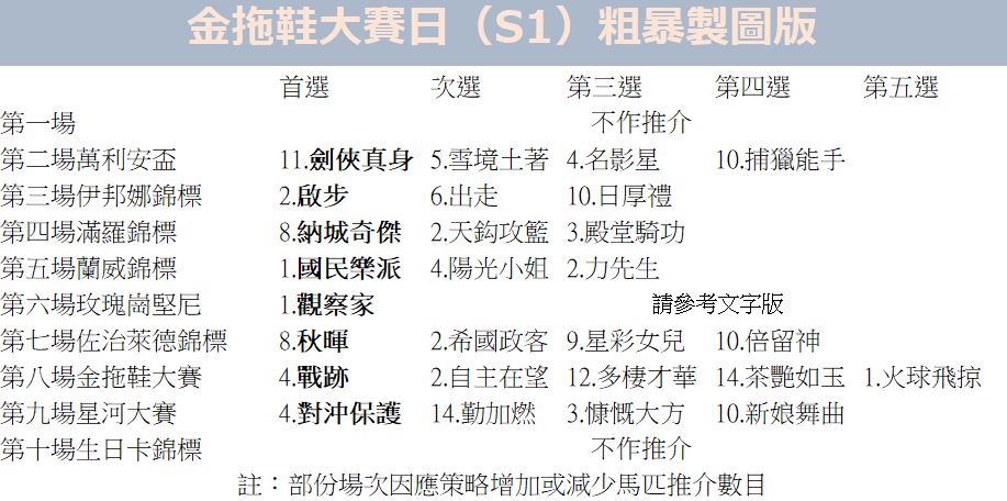 第八場金拖鞋大賽,「戰跡」於神奇百萬兩歲經典賽原成大熱,但因傷退出,雖然花多一場賽事才回復表現,不過總算在上週三級賽止血,有力趁亂勢奪冠。「自主在望」於藍鑽石錦標鬥足了整條直路,只是僅負「多棲才華」。至於「多棲才華」跑得頗為有點密,可作第三選。「茶艷如玉」於威司令錦標大勝而回,擺脫了藍鑽石錦標表現一般。「火球飛掠」上戰表現一般,評價難以避免下跌,但今場仍要小心。