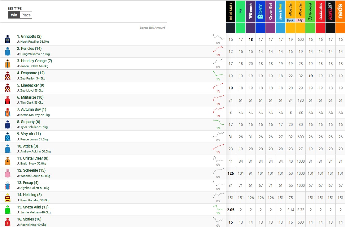 至於唐加士打一哩賽,比澳洲打吡早一場舉行,贏出蘭域堅尼的「紅妝力證」(Sheza Alibi)成為了頂頭大熱,因為牠的負磅太吸引。相對贏出蘭域堅尼的「秋風猛男」(Autumn Boy)更為吸引。「六十風度」(Sixites)早前在法雅納錦標補中。「巫師銀行」(Gringotts)以及「希國政客」(Pericles)。潘頓則策騎「揮發」(Evaporate)上陣。