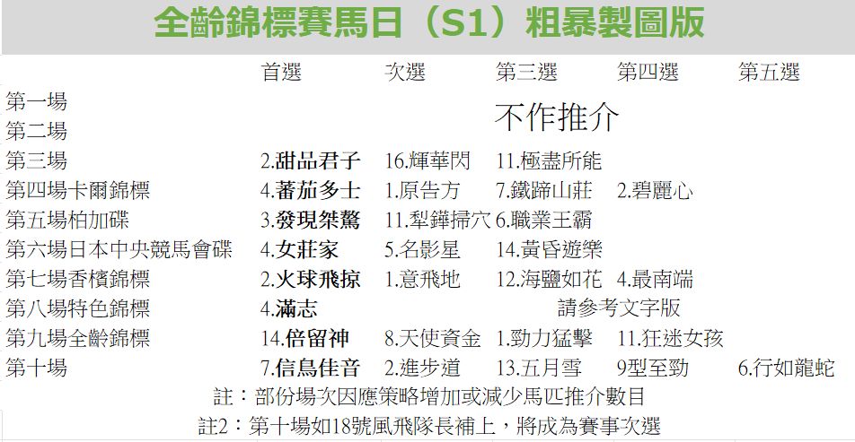最後就是全齡錦標「倍留神」看似是馬主跟至是練馬師的副車。如果能夠跑出金玫瑰錦標大勝水準,實在沒話可說,上週刻意試閘退出原定參與的二級賽。「天使資金」自跑完珠峰以來,其後出戰三場一級賽均能上名而回,實不簡單。「勁力猛擊」秋季狀態已經回復,即使今場沒有潘頓亦仍能順利發揮。「狂迷女孩」雖然久久沒有上陣,但賽前試閘對辦,黑馬機會。